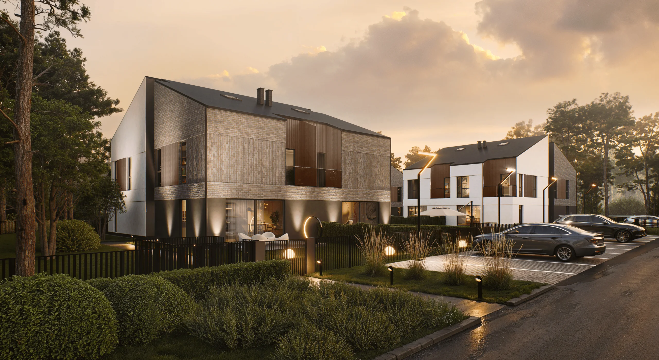 Nowoczesna architektura KAMPINO PARK to indywidualny projekt wykonany na zlecenie inwestora. Ponadczasowa, nowoczesna elewacja nadaje niebanalny charakter całej inwestycji oraz podkreśla wyjątkowość projektu. Kolorystyka utrzymana będzie w barwach eleganckiego antracytu, skontrastowana z elementami beżu. Stosowane materiały zostały odpowiednio dobrane pod kątem jakości i wytrzymałości, aby spełnić wymagania naszych klientów.